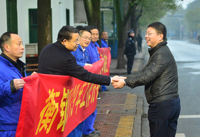 歡天喜地的新年祝福音樂(lè)在清冽的春風(fēng)里回蕩,公司領(lǐng)導(dǎo)及相關(guān)職能部門負(fù)責(zé)人在公司2號(hào)門、3號(hào)門,手持宣傳橫幅迎接上班員工?;鸺t的橫幅上分別寫著:衡鋼2019年工作方針“引領(lǐng)市場(chǎng)提升品質(zhì)強(qiáng)基固本砥礪奮進(jìn)”和“祝福全體員工及家屬新年快樂(lè),身體健康,工作順利,事業(yè)有成,家庭幸福”的標(biāo)語(yǔ)。多年以來(lái),公司工會(huì)組織領(lǐng)導(dǎo)迎接員工進(jìn)廠上班,既向員工恭賀新年,又宣傳了公司新一年的工作方針。