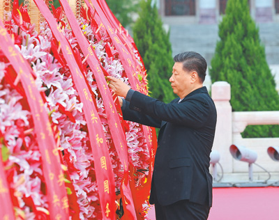 9月30日上午,黨和國家領導人習近平、李強、趙樂際、王滬寧、蔡奇、丁薛祥、李希、韓正等來到北京天安門廣場,出席烈士紀念日向人民英雄敬獻花籃儀式。這是習近平整理花籃上的緞帶。