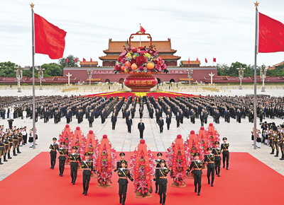 本報北京9月30日電 (記者趙兵)在慶祝中華人民共和國成立75周年之際,烈士紀念日向人民英雄敬獻花籃儀式30日上午在北京天安門廣場隆重舉行。黨和國家領導人習近平、李強、趙樂際、王滬寧、蔡奇、丁薛祥、李希、韓正等,同各界代表一起出席儀式。